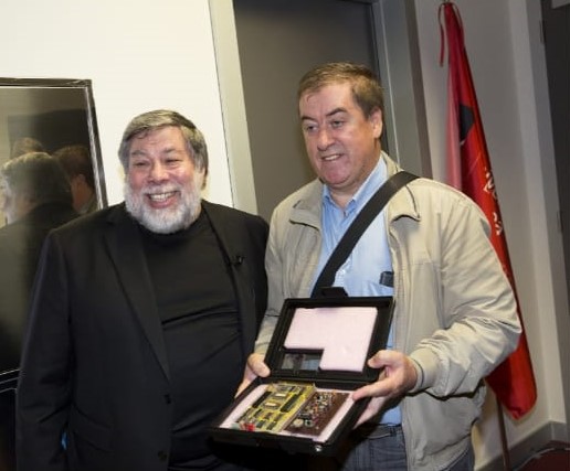 Hace veinticinco años, Wozniak lo miró a los ojos en aquella sala de la universidad Europea. A Manuel le tiembla en las manos su proyecto informático. Le muestra a Wozniak una por una las fecha anotadas en cada una de las piezas para recalcar la época de su composición, muy próxima a la creación de Apple I. El célebre ingeniero americano asentía entusiasmado, reconociendo el adaptador de tarjeta CFFA1-CF o la placa base con más de 60 chips. La conversación fugaz con Wozniak era el instante que llevaba imaginando veinticinco años. Un instante en el que percibió toda la admiración y el entusiasmo que tanto había ansiado. Antes de despedirse, se acercó a uno de los ayudantes del americano. “¿Nos puedes tomar una foto con mi móvil?”, le dijo. Necesitaba tener un recuerdo que inmortalizara el encuentro. El ayudante tomó el móvil mientras Manuel mostraba orgulloso su computadora al lado de su referente.