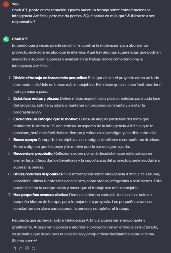 Con bastante entusiasmo y la confianza de quien domina el tema y casi que ha nacido con él, me cuentan numerosas formas en las que lo usan. Es más, lo tienen tan interiorizado que cuando les pregunto acerca de los prompts que utilizan, no tienen ni pajolera idea de lo que estoy hablando. Su conocimiento es empírico, no teórico, a lo David Hume. Como si los fabricaran con ello incorporado, lo tienen tan integrado que ni le prestan atención. En cuanto a los usos que le dan, el más recurrente es el de estructurar procesos largos con ChatGPT. Ante cualquier tarea, se sirven de la herramienta para elaborar bosquejos indizados en cualquier proyecto, ya sea un trabajo o un examen. Para estudiar suben los propios PDF con los apuntes de las asignaturas a la IA y le piden que extraiga los puntos principales para ahorrarse el tiempo que requiere la elaboración de esquemas propios, con el riesgo que conlleva.