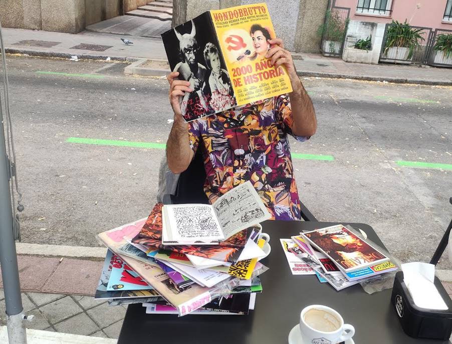 Solo hace unos instantes estaba esperando a Juan Fernando García en la boca del metro. Lo vi cruzar un paso de cebra mientras caminaba en mi dirección. Escaso pelo cano y enormes patillas también color ceniza. Sonríe. “Unos cuarenta y pocos”, pienso. Lleva una camisa muy llamativa y una mochila que parece bastante pesada. Más adelante descubriré que la mochila está cargada de fanzines, que García colocará sobre la mesa y a los que recurrirá reiteradamente para apoyar su narración. En el aire del barrio se mezclan los sonidos salseros que salen del interior de las caleñitas y los olores de las sartenes wok. En una calle con casas bajas y lejos de la vorágine que hay alrededor del metro, nos sentamos en la terraza. Apoya con cuidado la mochila sobre la mesa y en lo que pedimos voy preparando la grabadora. Juan Fernando García (luego me dirá que lo llame Juanfer) coge los cafés que trae el camarero y me acerca el mío.