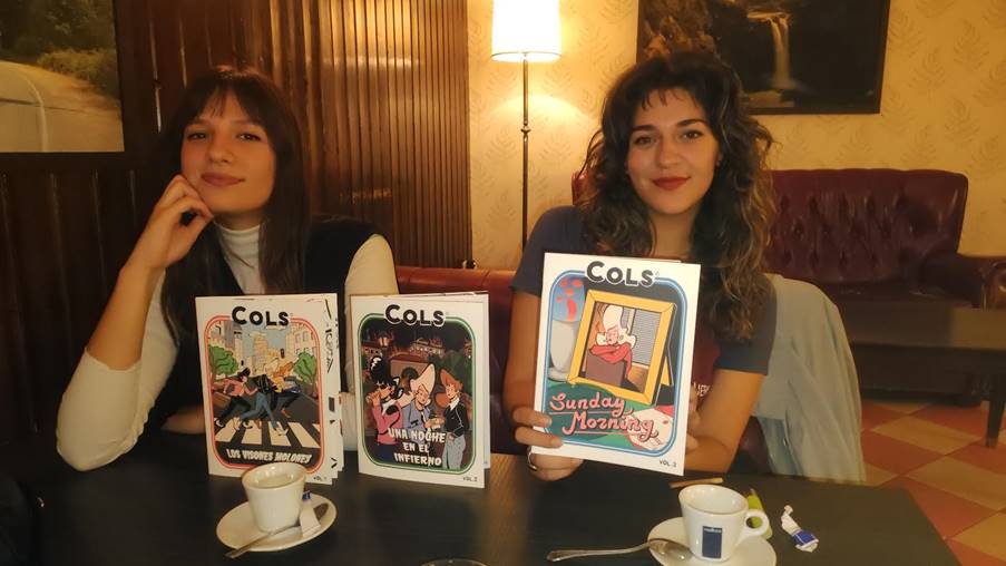 Hoy las chicas de Cols vienen vestidas de forma casual, pero entonces, cuando llegaron al Salón del Cómic de Barcelona como nominadas al premio al mejor fanzine por Cols, iban, como recuerda Olivia, “corporativas con las camisetas de Cols”. Sentadas en el lugar del anfiteatro asignado para ellas, escucharon: “El premio al mejor fanzine es para Una noche en el infierno de Cols Comics”. En La Estupenda las hermanas se miran como si estuvieran de nuevo delante del presentador. “Y empezaron a proyectar imágenes gigantes de Cols —dice Clara—. Yo recuerdo esta”.