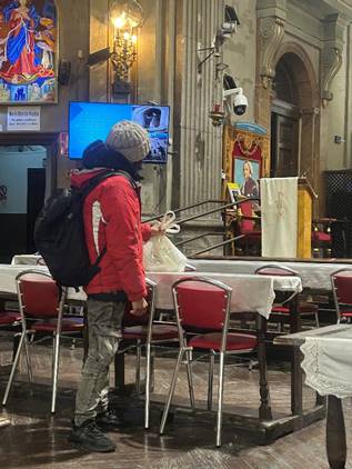 Ángel Díaz, Director de Operaciones de Mensajeros de la Paz, trajina de aquí para allá por los recovecos de la iglesia. Entra, sale, charla con algún que otro usuario. Su presencia es constante, como la de los voluntarios, cuyos chalecos refulgen como señales amarillas, punteando una especie de mapa de la solidaridad que hace que todo funcione aquí dentro. Díaz llegó a San Antón “por casualidad” hace una decena de años. “O quizá —corrige— fue una de esas casualidades que ya están escritas”. Un día se le rompió el teléfono móvil y entró en el local de reparación que había justo enfrente de la iglesia. Al salir, miró hacia la vieja, casi destartalada, puerta de entrada, y la cruzó. “No soy creyente, de verdad, ni religioso ni nada —dice—. Pero en esta iglesia se respira algo distinto”.