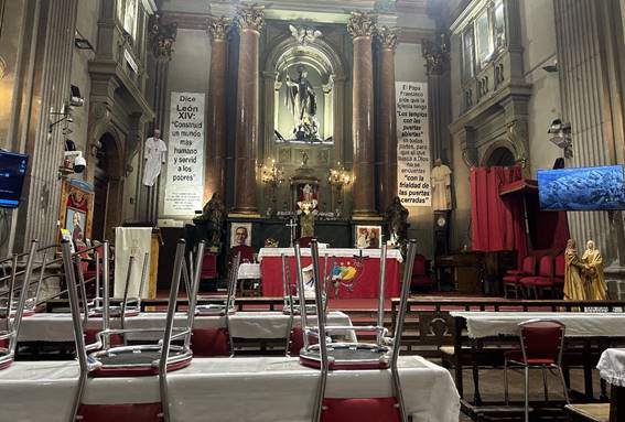 En el interior de la iglesia, muchos de los bancos, cubiertos con manteles de hule ribeteados de puntillas, se han convertido en mesas donde los usuarios, como los denominan desde la fundación, acaban de tomar el desayuno. Según la última encuesta sobre personas sin hogar, realizada en 2022 por el Instituto Nacional de Estadística (INE), 28.552 españoles han acudido a albergues y comedores sociales como el de la Iglesia de San Antón, un 24,5% más que hace diez años. En el zaguán de entrada, una máquina de “vending solidario” parece reciclada de una antigua máquina de tabaco. A su lado, se puede leer: “Pasa adelante. Es la casa de todos”. A la derecha según se entra, un gigantesco contenedor con forma de cesta de mimbre recibe a los visitantes, invitándolos a la donación de alimentos. También hay mesitas dispuestas para conversar en lugares discretos. A veces las ocupan asistentes sociales que atienden a los usuarios. De los 28.552 españoles que han acudido a albergues y comedores sociales, 4.146 lo han hecho en Madrid. Se podría colegir que casi el 10% ha desayunado entre estas paredes, adornadas con carteles de pontífices y santos de aspecto contemporáneo y con dos televisores que emiten en bucle imágenes de acciones solidarias de Mensajeros de la Paz. Postrada a los pies del altar, una escultura hiperrealista de la madre Teresa de Calcuta a tamaño natural inquieta al observador desprevenido. Hay enormes radiadores pintados extrañamente de azul y amarillo, los colores de la bandera asturiana. «Es la patria del padre Ángel —explicará luego la Directora de Comunicación— y son unos colores que a él le encantan”. La iglesia barroca del siglo XVII es más barroca que nunca si cabe por el gusto peculiar que ha impuesto el padre Ángel, que hoy tiene 88 años, y que lo ha llenado todo de azul y amarillo, amarillo asturiano en los radiadores, amarillo vaticano en algunos carteles y en el escudo de la fundación. “Es que él es muy barroco”, dice como argumentum irrefutabile la directora.