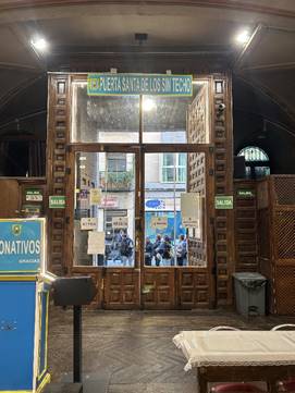 Tras ellos, una pancarta de material plástico cuelga sobre la vieja, casi destartalada, puerta de entrada. En ella se puede leer en letras blancas sobre fondo azul y ribetes amarillos, como si fuera un orgulloso cartel publicitario: PUERTA SANTA DE LOS SIN TECHO. Más allá, algunos voluntarios, identificados con chalecos amarillos, recogen los enseres de una cocina improvisada.